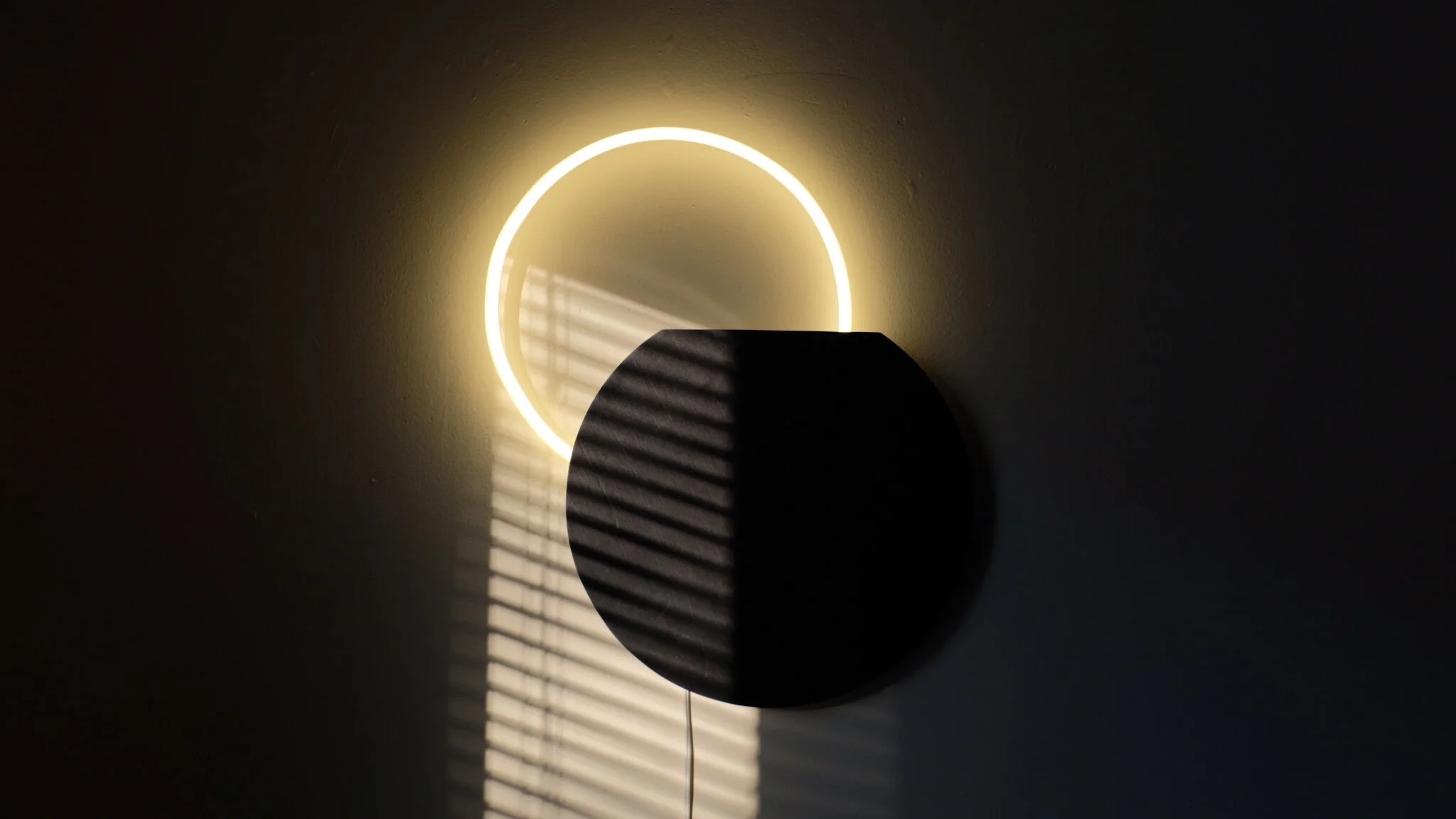 Warm white neon mounted to circular plywood backer