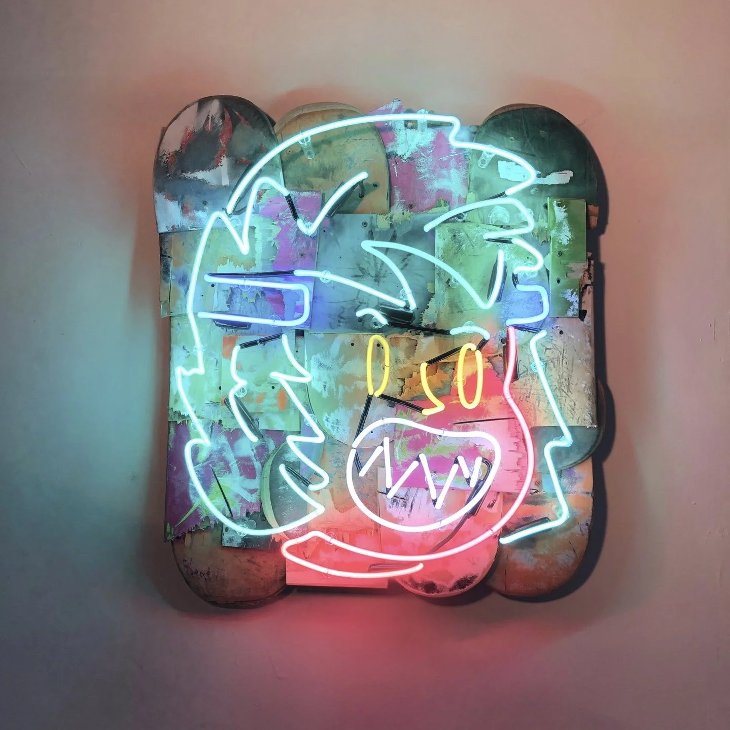 Collaboration with artist Ramiro Davaro-Comas. Multi-colored neon illustration mounted to salvaged skateboard decks. 2023.